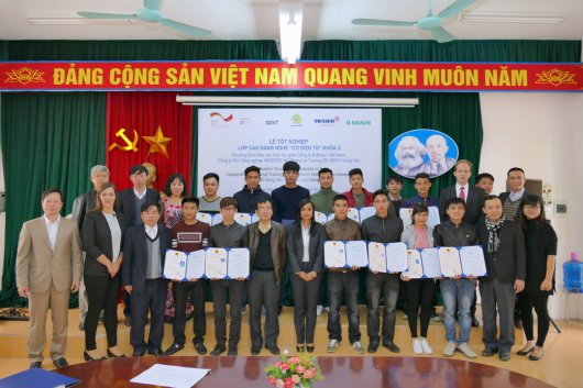“I am very proud to receive a degree which guarantees my immediate employment after graduation. I believe that the skills and knowledge I acquired during this training programme will be the basis for a successful career”, Mr Bui Thanh Binh stated. Mr Binh is one of the 14 graduates who, on February 10, 2017, received their certificates for completing the cooperative vocational training programme in mechatronics implemented by the German companies B. Braun Vietnam Co. Ltd., Messer Haiphong Industrial Gases Co., Ltd. and University of Technology and Education (UTE) Hung Yen. Since 2013, Messer, an industrial gas production and solution supplier, and B. Braun, a manufacturer of medical equipment, cooperate with UTE Hung Yen in implementing a jointly established training programme for mechatronics technicians. The involvement of the companies in the development and implementation of the training programme as well as in assessment ensures that the skills of the graduates meet the needs of the business sector. At the ceremony, representatives of UTE Hung Yen, B. Braun, Messer, Deutsche Gesellschaft für Internationale Zusammenarbeit (GIZ) GmbH and AHK Delegate of German Industry and Commerce in Vietnam, expressed their congratulations to the graduates as well as their appreciation for the improvement of the graduates’ skills.