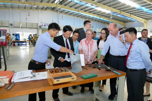 At LILAMA 2, capacity development activities of the Technical Cooperation (TC), implemented by GIZ ensure an effective use of the state-of-the-art equipment which was financed by BMZ and implemented by the German Development Bank (KfW). Through well-trained teaching staff of LILAMA 2, resulting from the on-going capacity development activities by the TC , LILAMA 2 will be able to offer high-quality, demand-oriented training based on the German standard in the future. During the workshop tour, Ms Möhring had the opportunity to witness the practical-oriented training approach applied at LILAMA 2. Mr Nguyen Khanh Cuong, rector of LILAMA 2, informed about the results and further ideas for cooperation. In addition, Dr Le Van Hien, President of LILAMA 2, explained the challenge faced by TVET institutes to recruit trainees, the need for the school management to think like the business sector and the necessity to train according to the demands of the business sector.