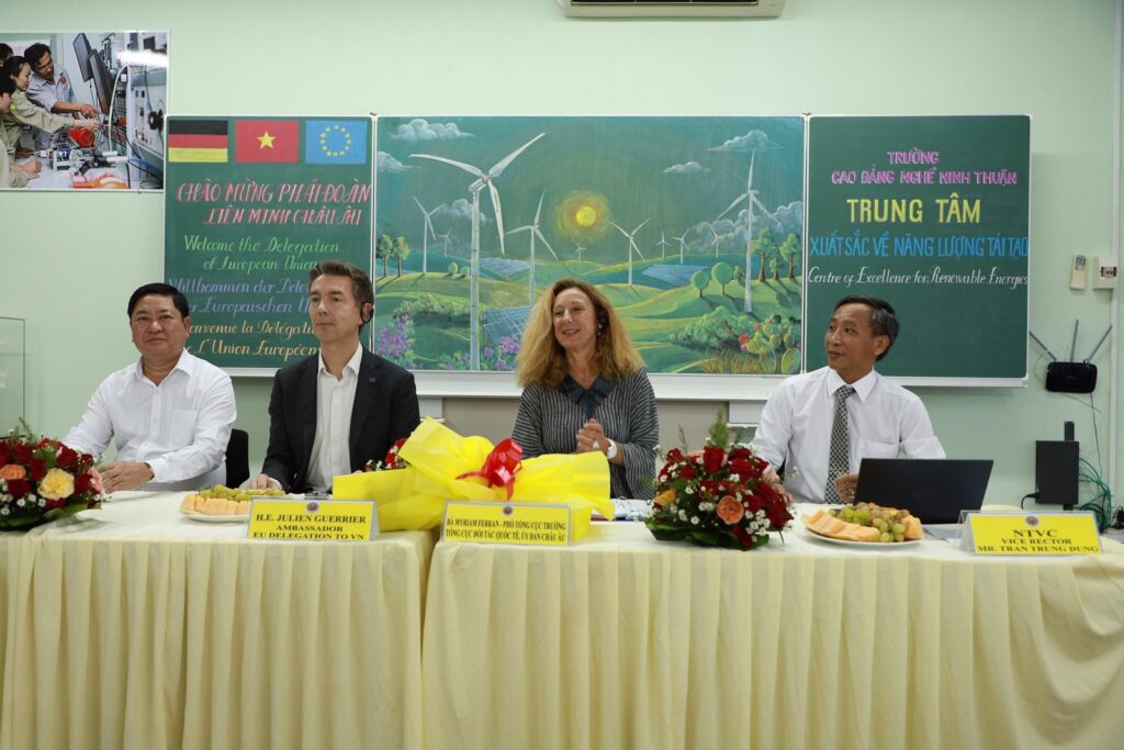 The Vietnamese Government plans to reach net zero greenhouse gas emissions by 2050 and promotes a green transition of its energy sector. This will lead to a growing demand for high-skilled technicians to manufacture, install, operate, and maintain renewable energy power plants and associated infrastructure. According to COBENEFITS STUDY, it is estimated that the further growth of wind and solar energy could lead to up to 435,000 full-time employment years by 2030. However, formal training in wind and solar energy is not yet in place and technicians from abroad are required to mitigate the lack of skilled workers in the field. The working visit of the EU Delegation in Viet Nam marks a potential of future cooperation in strengthening teaching and training capacity in the context of green and digital transformation, towards the college being the center of excellence for renewable energy.