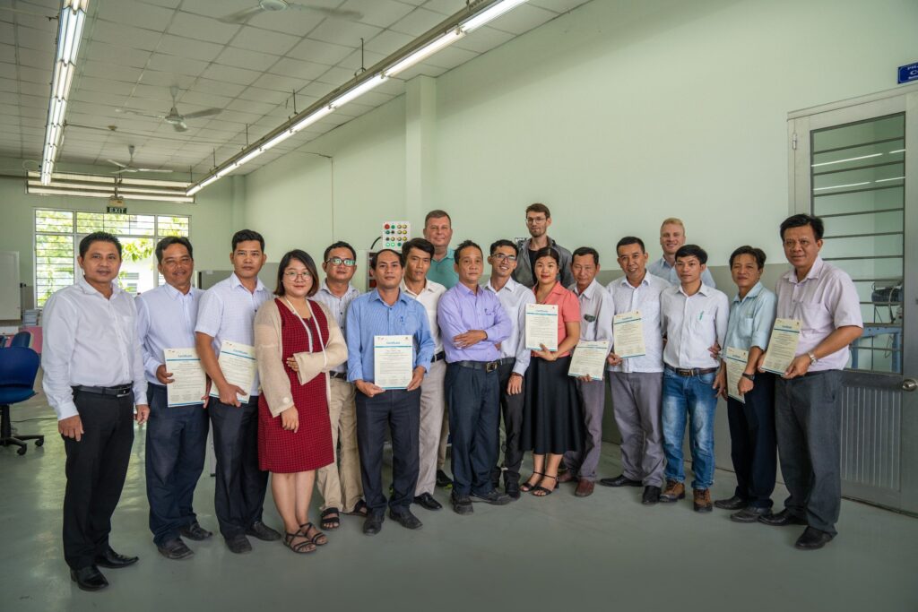 The training course was structured, planned, and carried out jointly by German experts from GIZ (Gesellschaft fuer Internationale Zusammenarbeit) and trainers/multipliers from LILAMA 2 International College of Technology to 11 examiners from 4 colleges (An Giang Vocational College, Hue Industrial College, Long An College, Ninh Thuan Vocational College) and 4 representatives from their partner companies. The multipliers played a central and key role by guiding the participants during this training and sharing their experiences made at LILAMA 2 College.