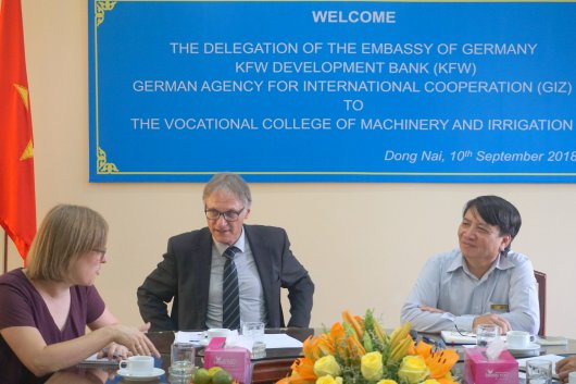 Representatives of the Embassy of the Federal Republic of Germany – Dr Wolfgang Manig, Deputy Head of Mission and Head of Economic Section, and Ms Luisa Bergfeld, First Secretary, Deputy Head of German Development Cooperation, together with Ms Simone Wunsch, Country Director of KfW Development Bank in Vietnam and officers from KfW and GIZ visited the Vocational College of Machinery and Irrigation (VCMI) on 10 September 2018 to get an overview of the planned and ongoing activities of the technical and financial development cooperation.