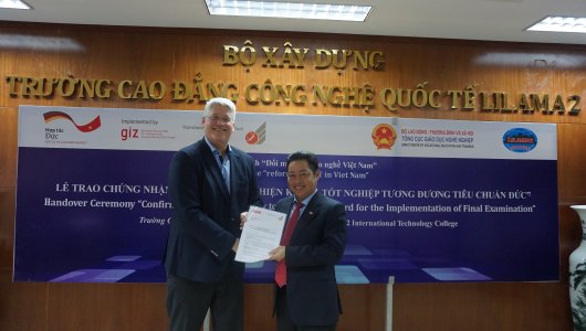 As a result, on 12 November 2019, at LILAMA 2 International College of Technology (LILAMA 2), Mr Thomas Malcherek, Chief Executive of Handwerkskammer (HWK) Erfurt (Chamber of Skilled Crafts), a German competent authority for vocational training and examinations, has handed over the official letter of “Equivalence Confirmation” for the implementation of final examinations oriented on German standard within the cooperative training programmes.