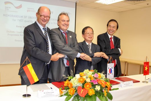 At the office of the Deutsche Gesellschaft für Internationale Zusammenarbeit (GIZ) GmbH (GIZ Office) today, GIZ and KOICA (the Korea International Cooperation Agency) signed a Memorandum of Understanding (MoU) on cooperation in supporting Vocational Training in Viet Nam for the duration of 2015-2017.
