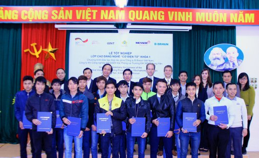 Today, 14 graduates of the cooperative vocational training programme in mechatronics received their certificates after 2 years of training. The programme was implemented in the frame of Public Private Partnership between the German companies B. Braun Vietnam Co. Ltd. and Messer Haiphong Industrial Gases Co., Ltd. and the University of Technology and Education (UTE) Hung Yen and GIZ. Representatives of the General Department for Vocational Training (GDVT) of MoLISA, UTE Hung Yen, B.Braun and Messer, the Deutsche Gesellschaft fuer Internationale Zusammenarbeit (GIZ) GmbH and the Delegate of German Industry and Commerce in Vietnam (AHK) attended the ceremony at UTE Hung Yen.