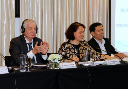 Challenges and solutions of steering the labour market towards a green economy in the context of international integration were discussed among representatives of ministries, companies, associations and TVET institutes at the workshop “Green growth associated with international integration in labor and social affairs” organised by the Ministry of Labour, Invalids and Social Affairs (MoLISA) with the support of the GIZ Macroeconomic Reform Program/Green Growth. Deputy Director of the International Cooperation Department of MoLISA, Ms Cao Thi Thanh Thuy, set the stage regarding opportunities and challenges for the labour market, social affairs and vocational training which result from international integration.
