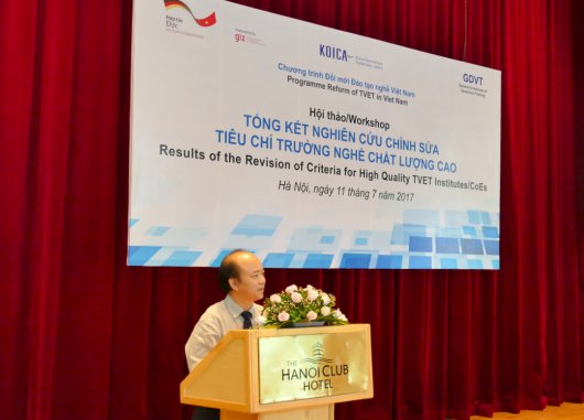 “The criteria catalogue of TVET institutes of High Quality and international standard will help increase the competitiveness of the manpower and of the economy of Viet Nam, in particular, via institutionalising the cooperation with the business sector, including enterprises, chambers and sector associations”, Associate Professor Cao Van Sam, Deputy Director of the General Directorate of Vocational Training (GDVT) of the Ministry of Labour, Invalids and Social Affairs (MoLISA) said in his opening speech at the Final Workshop on the results of the Revision of the Criteria for High Quality TVET Institutes that took place in Hanoi on July 11th, 2017.