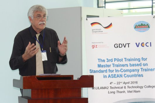 The first international Master Trainer Training in Viet Nam for in-company trainers has been successfully implemented from 04 to 22 April 2016 at LILAMA 2 Technical & Technology College. The training was conducted according to the curriculum based on the new developed Standard for In-Company Trainers (In-CT) in ASEAN Countries. This international event was organized by the project “Effective In-Company Training in the Mekong Region” with support of the “Programme Reform of TVET in Viet Nam”, both implemented by Deutsche Gesellschaft für Internationale Zusammenarbeit (GIZ) on behalf of BMZ, and LILAMA 2 as hosting TVET institute. Cooperation partners are the General Directorate of Vocational Training (GDVT) and Vietnam Chamber of Commerce and Industry (VCCI).