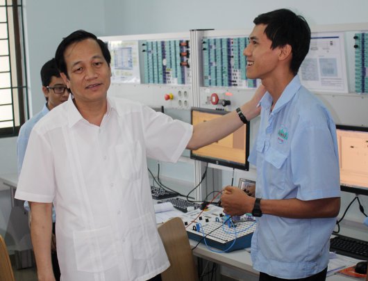 Today, Minister of Labour, Invalids and Social Affairs Dao Ngoc Dung visited LILAMA 2 International Technology College in Dong Nai. Together with Dr Truong Anh Dung, Deputy General Director of the General Directorate for Vocational Training (GDVT), he familiarised himself with the high quality training offers at LILAMA 2. The minister took the chance to exchange with the president of the college, Dr Le Van Hien, and the rector, Mr Nguyen Khanh Cuong, as well as with teaching staff and trainees and visited the workshops for Metal Cutting – CNC and Industrial Electronics.