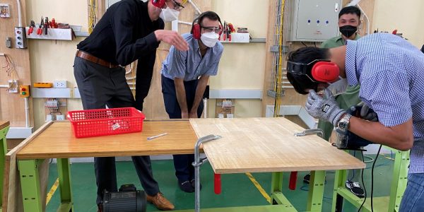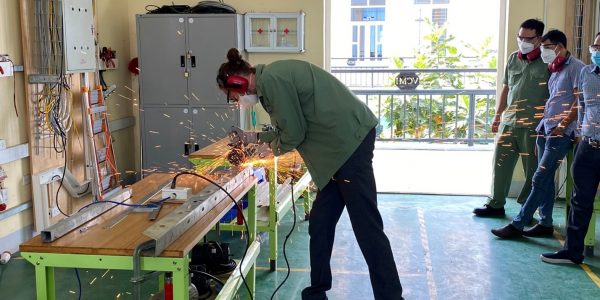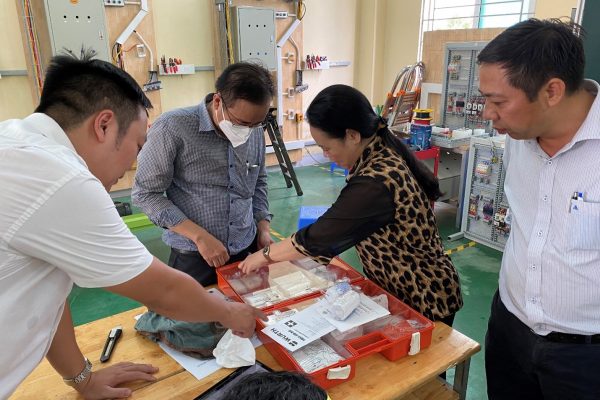 Globally, the safety-first rules are widely applied and obeyed in the industry. It is also undeniable that, especially for the occupation “Electronics for Energy and Building Technology “, work safety plays a more important role since the profession station is inclined to be in factories or construction fields. Therefore, on 20th, 28th and 29th July 2022, a training on Work Safety has been organised at the College of Machinery and Irrigation (VCMI) to equip the teachers in the occupation with this essential knowledge. The training was co-conducted by Mr Alexander Husenbeth and Mr Simon Parthum – Development Advisors of GIZ at VCMI and Long An College.