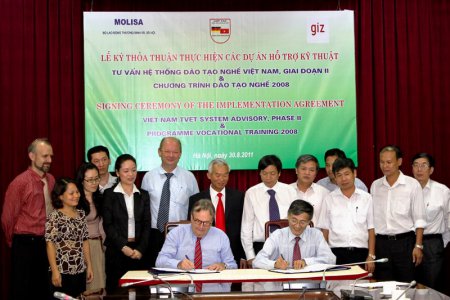 In the afternoon of 30/8/2011, the signing ceremony for Vietnamese-German projects “TVET System Advisory” and “Programme Vocational Training 2008” (PVT2008), two components of the “Programme Reform of TVET in Viet Nam” was held at the office of Ministry of Labour, Invalids and Social Affairs (MoLISA). The implementation agreements were signed by MoLISA and GIZ.