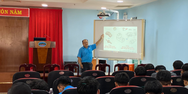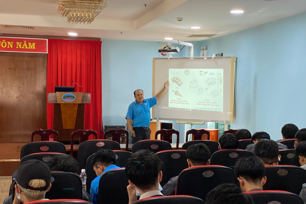 During the event, the students were also provided the instructions on using the personal protection equipment and detailed information on the final examination. Mr Tran Huu Phuoc, a Mechatronics teacher, instructed the students on how to use labour protection facilities such as jackets, gloves, shoes, glasses and helmets. Mr. Nguyen Hong Tien – Vice Dean of Mechanics Faculty – presented on the process and regulations of the final examination part one “Work Assignment with situational professional conversation” and the part two “Customer Order with situational professional conversation”. This also applies to the structure and weighting of the individual sections of the final examination as well as their scope in terms of time.