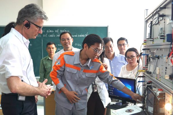 Having visited and experienced VCMI, Mr Giegerich was presented on the development history, achievements during the past few years of the college, and also the challenges that it has been facing during the process of developing VCMI to become a High-quality Institute for Green TVET by Mr Pham Duy Dong – the College Vice Rector. Mr Giegerich had the opportunity to visit the Green Building, recognized by the Vietnam Green Council with the achievement of the Golden Lotus in 2022. He was highly impressed with the application of workshops management and the pilot of the two new occupations which followed the concept of German standard oriented Cooperative Training, with the support from the Programme Reform of TVET in Vietnam: “Electronics for Energy and Building Technology” and “Mechanics for Sanitary, Heating and Climate Technology”. He highly appreciated the close cooperation of partner companies during the implementation process.