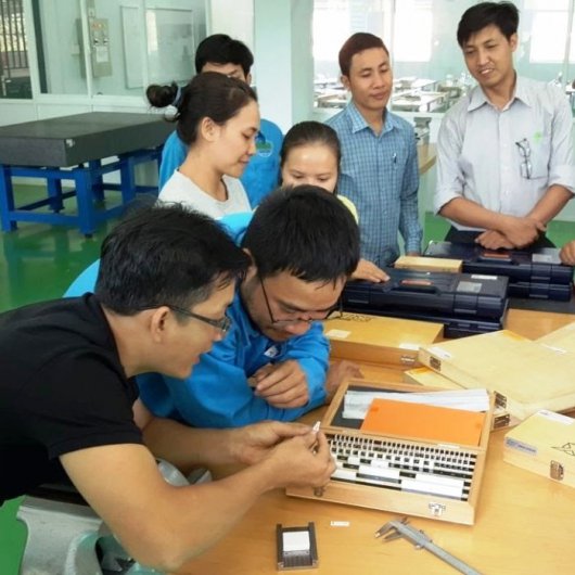 “Reading technical documents as well as the professional operation and maintenance of mechanical and electrical testing and measuring devices used in mechanical engineering are prerequisite qualifications for professional work planning and quality assurance during the whole manufacturing process”, explained Mr. Ricardo Bartsch. He is one of the German trainers who conducted the further training courses “Technical Communication”, “Testing and Measuring Technology” and “Conventional Metal Cutting” for up to 25 key teachers of LILAMA 2 International Technology College (LILAMA 2), Vocational College of Machinery and Irrigation (VCMI) and Dong Nai College of High Technology (DCoHT).