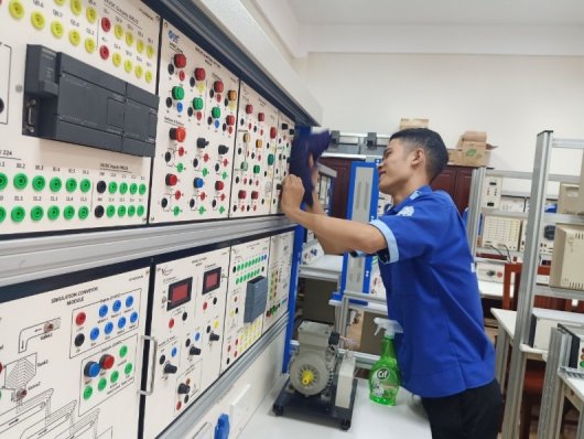 After a two-week-training, 4 electrical laboratories and 1 workshop have been re-organised to become more efficient and safer for training and learning than their previous stage. Obsolete and unused equipment and tools were sorted out; teaching materials, test-leads and wires were decluttered; rubber mats were cut and used to protect table tops professionally; tables, cabinets and training models were rearranged to give more space and convenient use; equipment units and tools were stored in order and labelled in the provided cabinets; safety signs, floor markings and labels were placed at necessary spots.