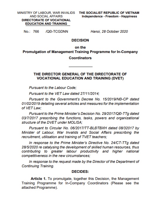 Decision on the Promulgation of Management Training Programme for In-Company Coordinators HoaNguyen Decision on the Promulgation of Management Training Programme for In-Company Coordinators Read More »
