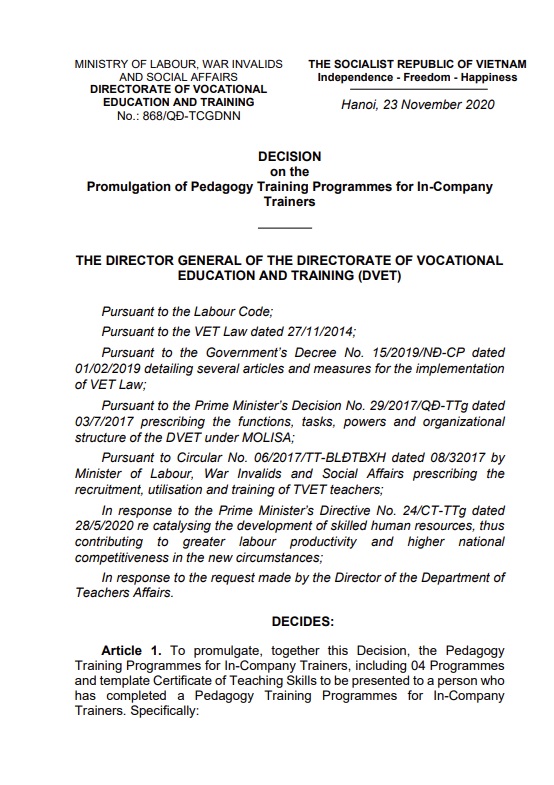 Decision on the Promulgation of Pedagogy Training Programmes for In-Company Trainers HoaNguyen Decision on the Promulgation of Pedagogy Training Programmes for In-Company Trainers Read More »