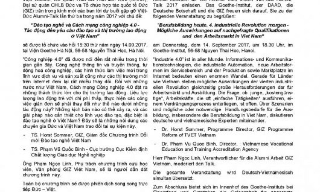 15.09.2017 TVET today, 4th Industrial Revolution tomorrow – Possible implications for the labour market and TVET in Viet Nam » Read more