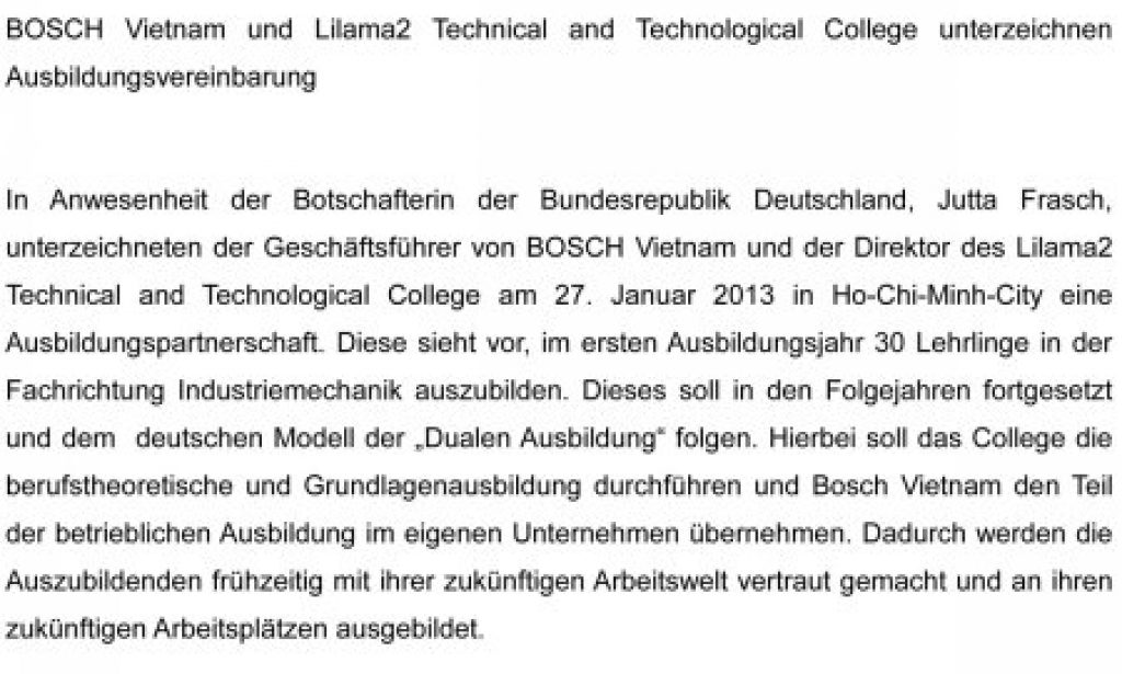 27.01.2013 Pressemitteilung: BOSCH Vietnam und Lilama2 Technical and Technological College unterzeichnen Ausbildungsvereinbarung » Read more