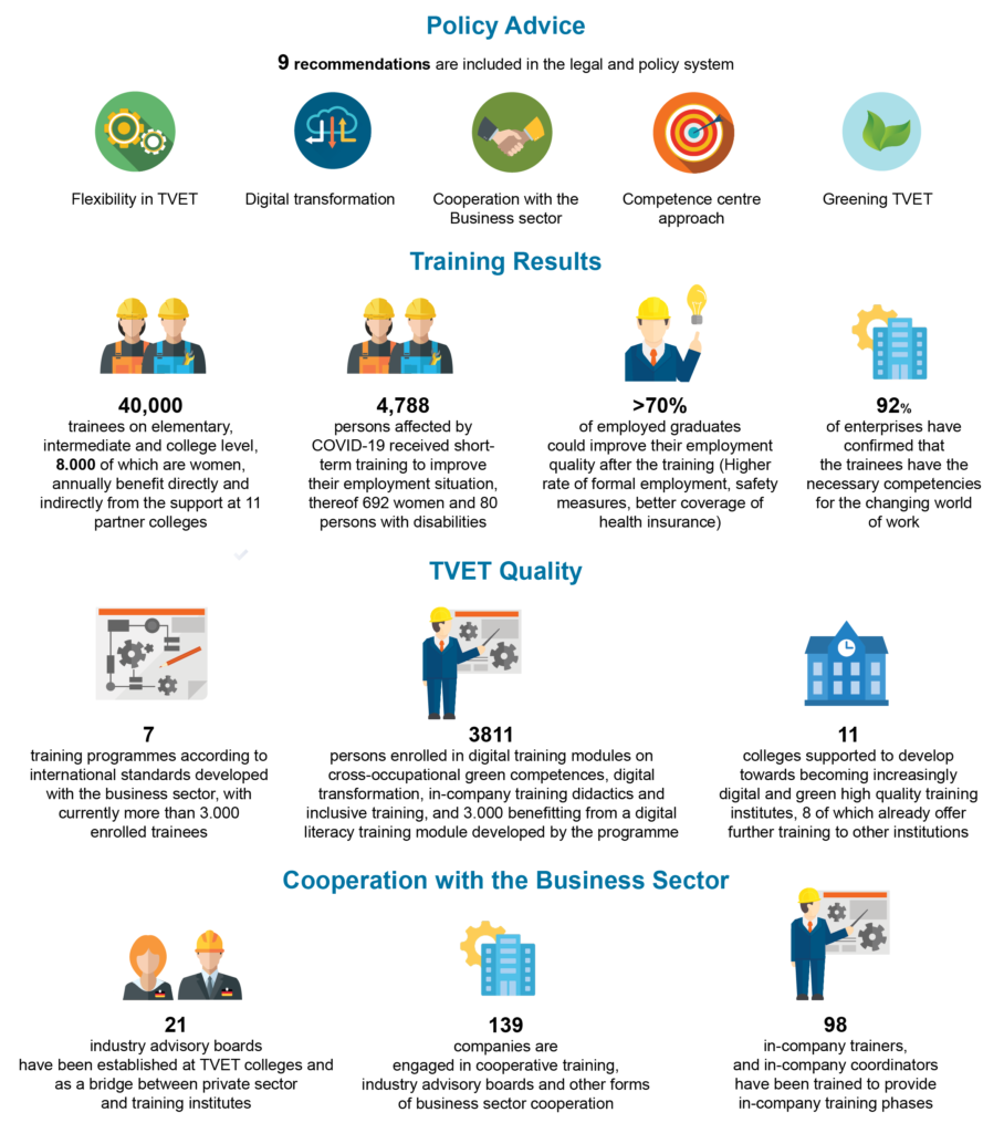 Business Cooperation: We promote the establishment and expansion of cooperation between TVET insitutes, the business sector and state management. The cooperation is intended to increase the relevance, quality and attractiveness of vocational education and training.