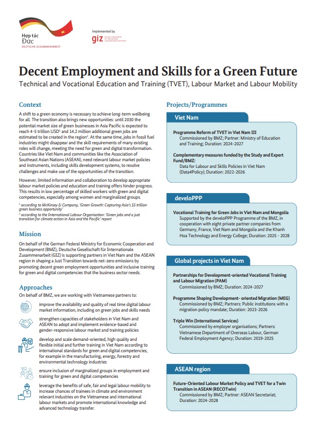 Viet Nam‘s technical and vocational education and training (TVET) system contributes to the socially just, green and digital transition. However, the TVET system and the skills of graduates do not yet fulfill the requirements of the twin transition towards a carbon-neutral economy, carbon-neutral and increasingly digital economy and aspires to leave no one behind.