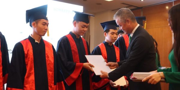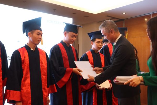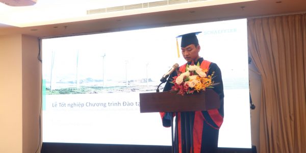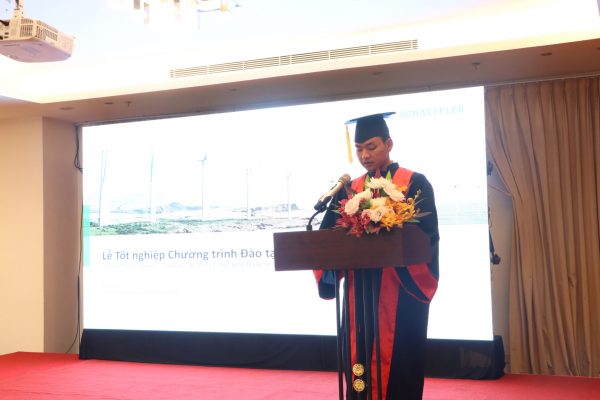 Sinh viên Hồ Bảo Hoàng Ân, đại diện của lớp Cắt gọt kim loại khóa K14, phát biểu tại buổi lễ: “Chúng em rất biết ơn sự chỉ dạy tận tình của các thầy cô và các cán bộ đào tạo tại công ty Schaeffler Việt Nam. Giờ đây, chúng em đã có kiến thức và kỹ năng vững vàng để cố gắng phấn đấu học tập và cống hiến trong tương lai.”