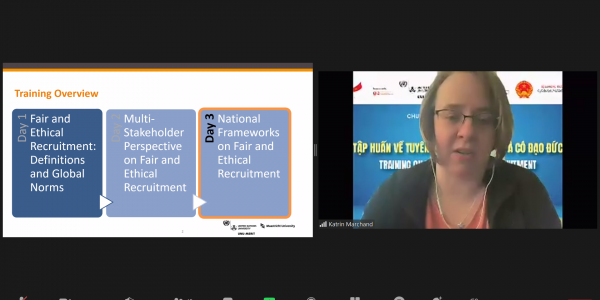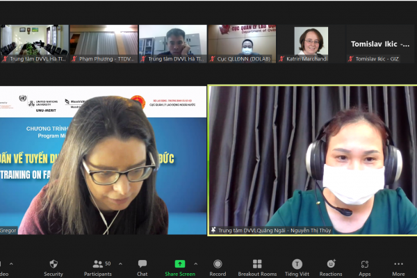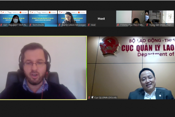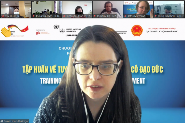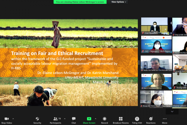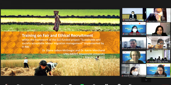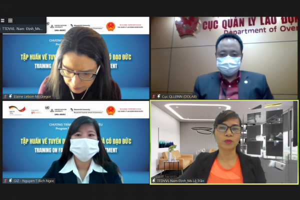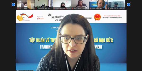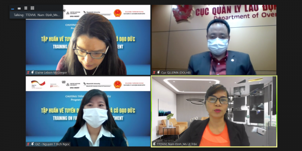 Trong 03 buổi chiều ngày 02, 03 và 04 tháng 3 năm 2022, Chương trình Di cư & Ngoại Kiều – Tổ chức Hợp tác Phát triển Đức (GIZ) đã phối hợp với Cục Quản lý Lao động Ngoài nước, Bộ Lao động Thương binh và Xã hội tổ chức Khóa tập huấn trực tuyến về Tuyển dụng công bằng và có đạo đức. Khóa tập huấn này cung cấp kiến thức về các tiêu chuẩn và quy định quốc tế và nâng cao kĩ năng thực hiện tuyển dụng công bằng và có đạo đức trong quá trình tuyển dụng lao động di cư.