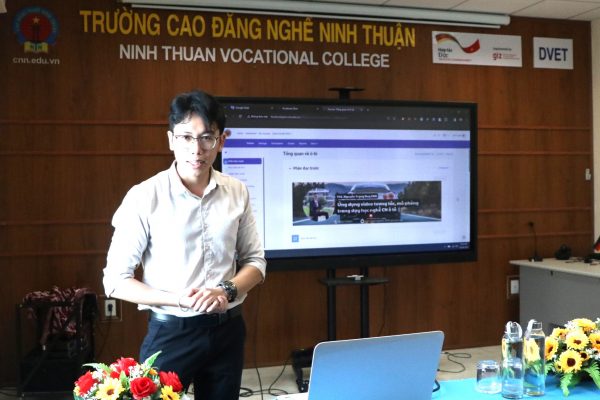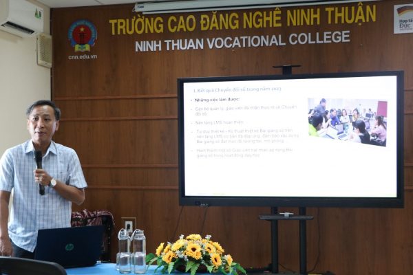 Tại sự kiện, Thầy Trần Trung Dũng – Hiệu phó NTVC đã có phát biểu trình bày kết quả triển khai các hoạt động CĐS tại NTVC do GIZ hỗ trợ thực hiện trong năm 2023 như: tổ chức hội thảo nhằm trao đổi, đánh giá về điều kiện hạ tầng Công nghệ thông tin cho CĐS; chia sẻ các kinh nghiệm trong quản lý dạy và học; khai thác vận hành các nền tảng số; triển khai các khóa đào tạo tại chỗ nhằm nâng cao năng lực số cho cán bộ và giáo viên… Các hoạt động này đã góp phần tác động tích cực đến nhận thức về CĐS của cán bộ, giáo viên trong trường; tạo động lực cho cán bộ, giáo viên cũng cố, phát huy các năng lực hiện tại và cải thiện các điều kiện hiện có.