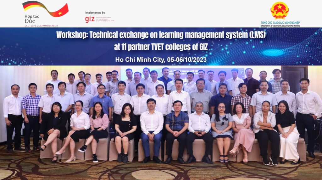 Trong hai ngày 05 và 06.10.2023, tại thành phố Hồ Chí Minh, hội thảo “Trao đổi Kinh nghiệm Phát triển Hệ thống Quản lý Học tập (LMS) tại 11 Trường Cao đẳng Đối tác của GIZ” đã diễn ra với sự tham gia của đại diện ban giám hiệu, đại diện phòng đào tạo, cán