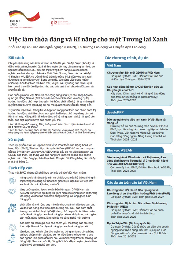 Chương trình “Đổi mới Đào tạo nghề Việt Nam” được ủy quyền bởi Bộ Hợp tác Kinh tế và Phát triển CHLB Đức (BMZ) và thực hiện bởi Tổ chức Hợp tác Quốc tế Đức (GIZ), phối hợp với Tổng cục Giáo dục nghề nghiệp (GDNN), thuộc Bộ Lao động – Thương binh & Xã hội (Bộ LĐ-TB&XH). Mục tiêu của chương trình là nâng cao chất lượng của GDNN để thích ứng với thế giới việc làm không ngừng thay đổi, ngày càng trở nên xanh và được số hóa hơn.
